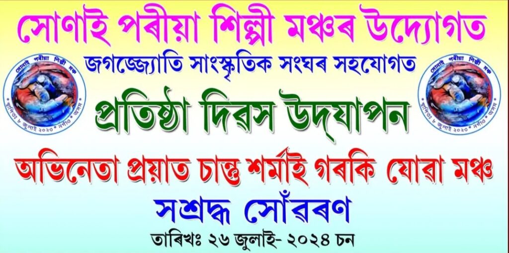 নিউজ ব্যুৰ’,নগাঁও,২৪জুলাই :–২০২৩চনৰ ৮জুলাইত নগাঁও জিলাৰ বৃহত্তৰ সোণাইপৰীয়া অঞ্চলৰ শিল্পীসকলৰ সামাজিক আৰু সাংস্কৃতিক ক্ষেত্ৰখনত উৎকৰ্ষ সাধনেৰে একত্ৰিত হৈ সোণাই নৈৰ সোঁতে সোঁতে চিৰকাল বোৱাঁই ৰখাৰ মানসেৰে ”সোণাইপৰীয়া শিল্পী মঞ্চ”ৰ প্ৰতিষ্ঠা হয় । মঞ্চৰ প্ৰতিষ্ঠা দিৱসটি অহা ২৬ জুলাইত (শুক্ৰবাৰে) বেবেজীয়াৰ সমীপৰ মাজগাঁৱত আয়োজন কৰা হৈছে । ইতিমধ্যে দয়ানন্দ গোস্বামীক সভাপতি আৰু কিশোৰ কুমাৰ শইকীয়াক সম্পাদক ৰূপে লৈ এখনি প্ৰতিষ্ঠা দিৱস উদযাপন সমিতি গঠন কৰা হৈছে । মাজগাঁৱৰ জগজ্জ্যোতি নাট্য মন্দিৰৰ সাংস্কৃতিক মঞ্চ প্ৰাংগণত আয়োজিত ”সোণাইপৰীয়া শিল্পী মঞ্চ”ৰ প্ৰতিষ্ঠা দিৱসৰ দিনযোৰা কাৰ্যসূচী অনুসৰি পুৱা পতাকা উত্তোলন আৰু গছপুলি ৰোপনৰ পাছতে চিত্ৰাংকন প্ৰতিযোগিতা আৰু বিয়লি “শিশুসকলৰ প্ৰতিভা বিকাশৰ সাংস্কৃতিক অনুষ্ঠান” অনুষ্ঠিত হ’ব । সন্ধ্যা বন্তি প্ৰজ্বলন আৰু সম্বৰ্ধনা অনুষ্ঠানৰ অন্তত নিশা আমন্ত্ৰিত শিল্পী আৰু সোণাইপৰীয়া শিল্পী মঞ্চৰ শিল্পীসকলৰ সাংস্কৃতিক অনুষ্ঠান অনুষ্ঠিত হ’ব বুলি সভাপতি জিতু শ্ৰাৱণ আৰু সম্পাদক কাঞ্চন কুমাৰ বৰদলৈয়ে জনাইছে । উল্লেখ্য যে প্ৰতিষ্ঠা দিৱসটিৰ যোৱা ৮ জুলাইত আয়োজন কৰা হৈছিল যদিও ৰাজ্যত হোৱা বানপানীৰ পৰিপ্ৰেক্ষিতত বানাক্ৰান্ত ৰাইজৰ দুখ-দুৰ্দশাৰ সমভাগী হৈ অনিদিষ্ট তাৰিখলৈ অনুষ্ঠানটি পিছুৱাই দিয়া হৈছিল। ৰাজ্যৰ বান পৰিস্থিতি কিছু উন্নত হ’লে অনুষ্ঠানটি আয়োজনৰ সিদ্ধান্ত গ্ৰহণ কৰা হয় । প্ৰতিষ্ঠা দিৱসৰ সমূহ কাৰ্যসূচীত ৰাইজৰ সহায় তথা সহযোগ উদ্যোক্তাসকলে কামনা কৰিছে ।