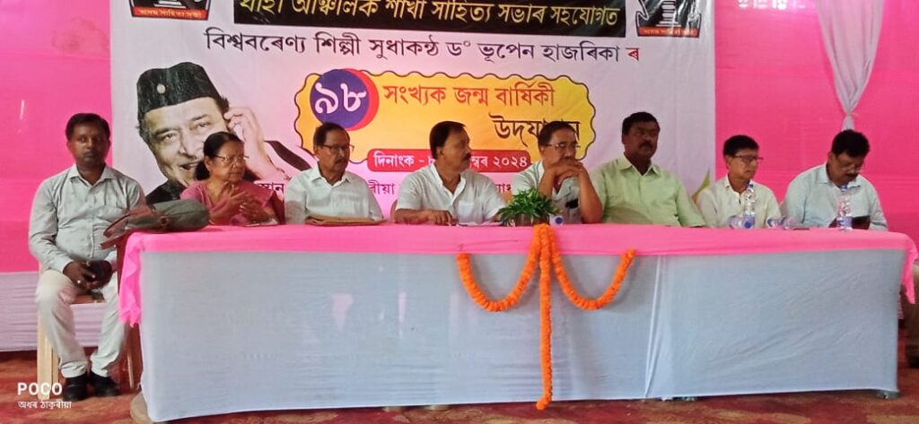 নিউজ ব্যুৰ’,নগাঁও,৮ছেপ্টেম্বৰ:-নগাঁও জিলা সাহিত্য সভাৰ উদ্যোগত আৰু ঘাঁহী আঞ্চলিক শাখা সাহিত্য সভাৰ সহযোগত বিশ্ব বৰেণ্য শিল্পী,সুধাকণ্ঠ ড° ভূপেন হাজৰিকাদেৱৰ ৯৮সংখ্যক জন্মদিৱসটি ৰবিবাৰে দিনযোৰা কাৰ্যসূচীৰে উদযাপন কৰা হয়। এই উপলক্ষে ঘাঁহী-ম’হমৰীয়া আঞ্চলিক হাইস্কুলত অনুষ্ঠিত কাৰ্যসচীৰ অংশ ৰূপে শিল্পীগৰাকীৰ প্রতি শ্রদ্ধা জনাই পুৱা ৮:৪৫ বজাত শাখাৰ সভাপতি হৰেন বৰাই অসম সাহিত্য সভাৰ পতাকা উত্তোলন কৰাৰ পাছতে ৯ বজাত ড° ভূপেন হাজৰিকাৰ আৱক্ষ মূর্তিত মুখ্য তর্পকৰূপে শ্রদ্ধাঞ্জলি জ্ঞাপন কৰে ভদ্রকান্ত দাসে। ইয়াৰ পিছতে নগাঁও জিলা সাহিত্য সভাৰ সভাপতি থগিত মহন্তৰ সভাপতিত্বত অনুষ্ঠিত মুকলি সভাখন আনুষ্ঠানিকভাৱে উদ্বোধন কৰে জিলা সভাৰ প্ৰাক্তন সভাপতি নিত্যানন্দ বৰাই। সভাত নগাঁও জিলা সাহিত্য সভাৰ প্রাক্তন সম্পাদক তথা আঞ্চলিক সম্পাদকদ্বয় যতীন্দ্র নাথ সূত,মৃণাল হাজৰিকা আৰু বৰ্তমান নগাঁও আঞ্চলিক কার্যালয়ৰ সাংগঠনিক সম্পাদক বিনু লস্কৰ ঠাকুৰীয়াই বিশিষ্ট অতিথি হিচাপে উপস্থিত থাকি সুধাকণ্ঠ ড° ভূপেন হাজৰিকাৰ জীৱন,সংগীত আৰু তেখেতে কৰা সকলো কাৰ্য সন্দৰ্ভত বিশদভাবে ব্যাখ্যা দাঙি ধৰে। জিলা তথা শাখাৰ সম্পাদকদ্বয় ৰেৱত কুমাৰ হাজৰিকা আৰু ৰেব কান্ত দাসে আঁত ধৰা অনুষ্ঠানটোত শাখাটোৰ প্ৰতিষ্ঠাপক সম্পাদক তথা সমাজকৰ্মী বল্লদেৱ শৰ্মাই শাখাৰ পত্ৰিকা সম্পাদক তৰুণ চন্দ্ৰ বৰাৰ সুধাকণ্ঠ ড° ভূপেন হাজৰিকাৰ জীৱন ভিত্তিক “মানুহে মানুহৰ বাবে” শীৰ্ষক গ্ৰন্থখনি উন্মোচন কৰে। সভাত অসম সাহিত্য সভাৰ প্ৰাক্তন কেন্দ্ৰীয় কাৰ্যনিৰ্বাহক আবুল খয়াৰ আহমেদ,মাহেকীয়া বাৰ্তালোচনী ”ৰণাংগন”ৰ সম্পাদক মিণ্টু দাস, জিলা সহ-সম্পাদক ৰাজীৱ কুমাৰ হাজৰিকা, কাৰ্যালয় সম্পাদক অধৰ ঠাকুৰীয়া, জিলা সাহিত্য সভাৰ অন্তৰ্গত বিভিন্ন শাখাৰ সভাপতি-সম্পাদক,প্ৰমুখ্যে কেইবাগৰাকী বিশিষ্ট ব্যক্তিৰ লগতে হাইস্কুলখনৰ ছাত্ৰ-ছাত্ৰী উপস্থিত থাকে। উল্লেখ্য যে,এই অনুষ্ঠানৰ পিছতে ভূপেন্দ্র সংগীত প্রতিযোগিতা অনুষ্ঠিত হয়। সন্ধিয়া ৯৮ গছি বন্তি প্ৰজ্বলনৰে সুধাকণ্ঠৰ ওপজাদিনৰ কাৰ্যসূচীৰ সফল সামৰণি পৰে। ইপিনে,হাতীচোং শংকৰদেৱ চিত্ৰকলা বিদ্যালয় আৰু সোণাইপৰীয়া শাখা কবি সন্মিলনৰ উদ্যোগতো “ভূপেনদা স্মৰণ” কাৰ্যসূচী ৰূপায়ণ কৰা হয়। পুৱা ৯ বজাত চমুৱাগাঁৱৰ এপ্ৰিলতল তিনিআলিৰ শংকৰদেৱ চিত্ৰকলা বিদ্যালয়ত অনুষ্টুপীয়াকৈ অনুষ্ঠিত এখনি শ্ৰদ্ধাঞ্জলি সভাত ড° ভূপেন হাজৰিকাদেৱৰ ৯৮ সংখ্যক পৱিত্ৰ জন্মতিথিত শংকৰদেৱ চিত্ৰকলা বিদ্যালয় আৰু সোণাইপৰীয়া শাখা সন্মিলনে গভীৰ শ্ৰদ্ধাঞ্জলি জ্ঞাপন কৰে।বিদ্যালয়ৰ চৌহদত থকা প্ৰতিমূৰ্তিত এগচি বন্তি প্ৰজ্বলন কৰে বিদ্যালয়ৰ উপদেষ্টা ভৱেন মেধি আৰু মাল্যপ্ৰদান ক