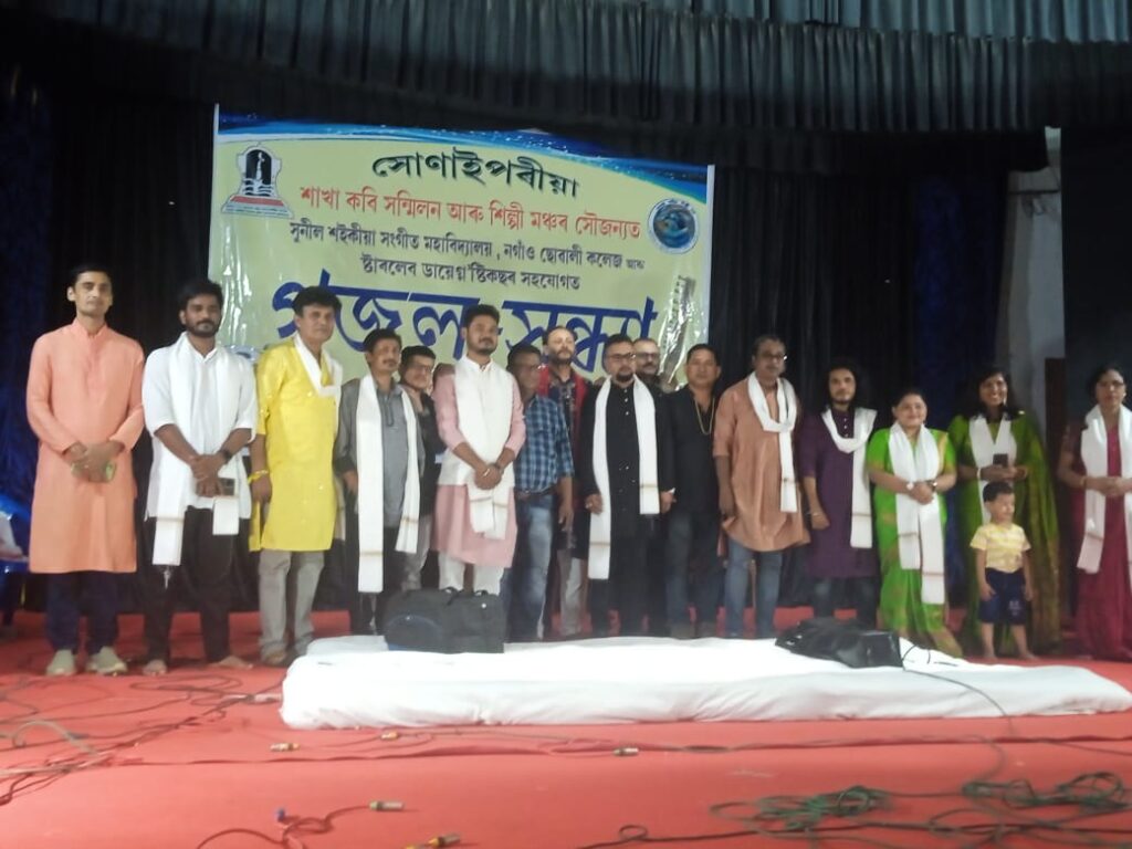 নিউজ ব্যুৰ’,নগাঁও,২১অক্টোবৰ:–এক অভিনৱ চিন্তা আৰু পৰিকল্পনাৰে সোণাইপৰীয়া শাখা কবি সন্মিলন আৰু সংগীত শিল্পী মঞ্চৰ সৌজন্যত তথা সুনীল শইকীয়া সংগীত মহাবিদ্যালয়, নগাঁও ছোৱালী কলেজ,ষ্টাৰলেৱ ডায়েগ্ন’ষ্টিকছৰ সহযোগত ৰবিবাৰে এটি সন্ধিয়া “গজল সন্ধ্যা” আয়োজন কৰা হয়। নগাঁও ছোৱালী মহাবিদ্যালয়ৰ “ৰংগম” প্ৰেক্ষাগৃহত আয়োজিত অনুষ্ঠানত বন্তি প্ৰজ্বলনেৰে শুভাৰম্ভ কৰে অসমৰ প্ৰখ্যাত গজলকাৰ ক্ৰমে আৰিফুল হক,কন্ঠশিল্পী সুৱাগমণি মহন্ত,সদৌ অসম কবি সন্মিলনৰ প্ৰাক্তন সভাপতি প্ৰদীপ শইকীয়া, বাঁহীবাদক দীপক শৰ্মা আৰু শশীকান্ত নাথে। আৰিফুল হকৰ দুটি গজলেৰে গজল সন্ধ্যা আৰম্ভ হোৱা সংস্কৃত শিল্পী ৰঞ্জন বেজবৰুৱাই সংস্কৃত আৰু উৰ্দু দুয়োটা ভাষাতে গজল পৰিৱেশন কৰে। অনুষ্ঠানত অসমৰ উদীয়মান কবি তথা শ্যায়ৰ সঞ্জীৱ সাগৰ চৌধুৰীৰ উৰ্দু আৰু অসমীয়াত ৰচিত ১৪গজল আৰু নজমৰ এক অভিনৱ সংগীতানুষ্ঠানো অনুষ্ঠিত হয়।ৰাজ্যখনৰ কেইবাগৰাকীও নবীন-প্ৰবীণ কণ্ঠশিল্পী তৰুণ শইকীয়া, জিতু শ্ৰাৱণ,কানু কন্দলী,কুমাৰ কিশোৰ,কল্পিতা দেৱী,স্বপ্নালী কলিতা, নিলোৎপল গায়ন,নিপু মেধি আৰু নিভাৰাণী বৰাই উপস্থিত প্ৰায় দুই শতাধিক লোকক মন্ত্ৰমুগ্ধ কৰি ৰাখে। অনুষ্ঠানত প্ৰাঞ্জল বৰা,মুকুল বৰা, অভিষেক ধৰ,অতুল মহন্ত,দুলু বৰা, ৰক্তিম লস্কৰ,বাবুল বৰাৰ দৰে নিপুণ বাদ্যশিল্পীয়ে বাদ্য সংগত কৰে। গজল সন্ধ্যাত নগাঁও ছোৱালী মহাবিদ্যালয়ৰ অধ্যক্ষ ড° কুলেন চন্দ্ৰ দাস,গল্পকাৰ শিৱানন্দ কাকতি,লেখক পুনিৰাম শইকীয়া,সাংবাদিক অজয় মাহাতু, কবি-গল্পকাৰ ড° গিৰীন্দ্ৰ নাথ, ডুগডুগীৰ স্বত্বাধিকাৰ উৎপল বণিয়া, বিশিষ্ট কবি মদাৰজ্যোতি,”নতুন কবিতা”ৰ সম্পাদক মৃদুল চহৰীয়া,কবি সন্মিলনৰ সম্পাদক পৱন শৰ্মা, সাংগঠনিক সম্পাদক ভৱেন চন্দ্ৰ নাথ, নগাঁও জিলা কবি সন্মিলনৰ প্ৰাক্তন সভাপতি দ্বিজেন্দ্ৰনাথ হাজৰিকা, বৰ্তমানৰ সভাপতি দুৰ্গেশ্বৰ বৰকটকী, মৰিগাঁও জিলা কবি সন্মিলনৰ প্ৰাক্তন আৰু বৰ্তমানৰ সভাপতি ক্ৰমে আবুল হাচান আল কামান আৰু অনুৰূদ্ধ ডেকা,লেখিকা কৰৱী লিগিৰা,মিনতি দেৱী কাকতি,কৰৱী শইকীয়া,দক্ষিণা দেৱী গজুৰেল,কবি কুমাৰ বিভুতি, শিক্ষক-সাংবাদিক সমীৰ হাজৰিকাকে প্ৰমুখ্য কৰি বহুকেইগৰাকী গণ্যমান্য লোক উপস্থিত থাকে। অনুষ্ঠানৰ শেষত সদ্য প্ৰয়াত সংগীত শিল্পী আতিকুৰ ৰহমান আৰু দীগেন মহন্তৰ প্ৰতি শ্ৰদ্ধা জনাই এক মিনিট মৌনপ্ৰাৰ্থনা কৰা হয়। সঞ্জীৱ সাগৰ চৌধুৰীয়ে প্ৰদান কৰা শলাগৰ শৰাইৰ পিছতে “কাব্য-মন্ত্ৰ”ৰে গজল সন্ধ্যাটিৰ সামৰণি মৰা হয়।