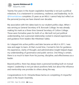 Concluding his message, Baruah congratulated Sarma for completing 25 impactful years in the Assembly, stating that leadership is defined not merely by positions held, but by the inspiration and mentorship one offers to others.