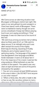 The situation reportedly escalated late at night when a public gathering began nearby. The author claimed that a speech, delivered in a mix of Bangladeshi char language and Hindi, continued until around 1 am and appeared to be addressed to a large audience.