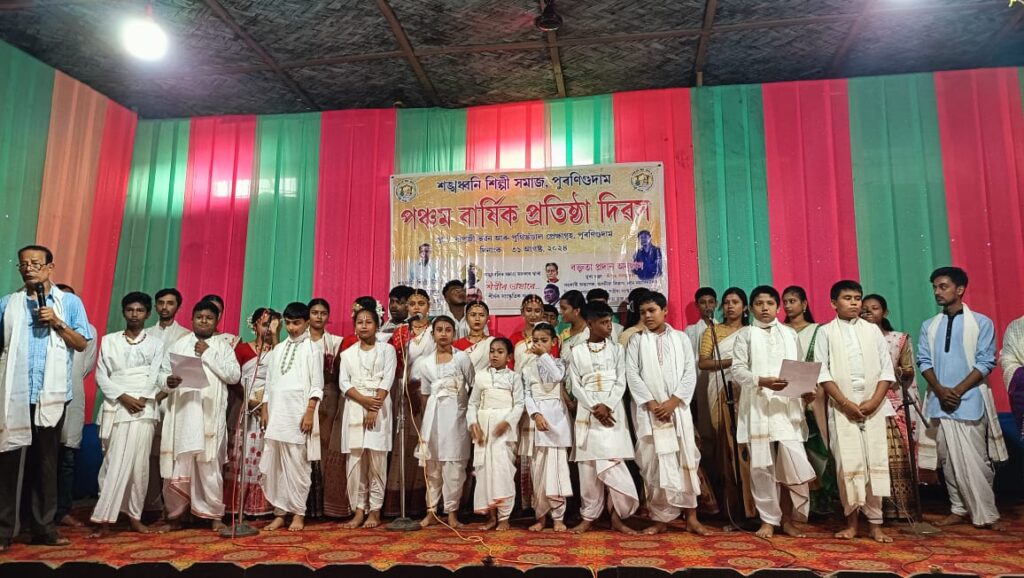 নিউজ ব্যুৰ’,নগাঁও,১ছেপ্টেম্বৰ:– নগাঁও জিলাৰ পুৰণিগুদাম অঞ্চলৰ অগ্ৰণী সামাজিক আৰু সাংস্কৃতিক অনুষ্ঠান “শঙ্খধ্বনি শিল্পী সমাজ”ৰ পঞ্চম বাৰ্ষিক প্ৰতিষ্ঠা দিৱস যোৱা ৩০ আৰু ৩১ আগষ্টত অনুষ্ঠিত হৈ যায়। বাপুজী ভৱন আৰু পুথিভঁৰাল প্ৰেক্ষাগৃহত অনুষ্ঠিত পঞ্চম বাৰ্ষিক প্ৰতিষ্ঠা দিৱসটি ৩০ আগষ্টত পুৱা পতাকা উত্তোলনৰ পাছত ৩১আগষ্টত পাঁচ গছি বন্তি প্ৰজ্বলনেৰে শুভাৰম্ভণি কৰে প্ৰতিষ্ঠাপক সভাপতি দীপিকা বৰা গায়ন,ফণীন্দ্র নাথ গায়ন, পুলিন হাজৰিকা,বিনোদ ভূঞা আৰু ডিম্বেশ্বৰ গায়নে। পৰৱৰ্তী সময়ত শঙ্খধ্বনিৰ সদস্যসকল ক্ৰমে দুৱৰি শইকীয়া,শতভিষা গায়ন,কাব্যশ্ৰী গায়ন, লুনা গায়ন,কাব্যশ্ৰী কাশ্যপ,ভাস্কর্য শিল্পী পূৰ্ণ গায়ন,হৰ্ষিতা গায়নে আৰু কুৱঁলী শইকীয়াই শ্ৰীশ্ৰী মাধৱদেৱ বিৰচিত গুৰুজনাৰ এটি বৰগীত পৰিৱেশন কৰে । সাংস্কৃতিক অনুষ্ঠানটিৰ আঁত ধৰে চুমকী বৈৰাগীয়ে। উল্লেখ্য যে,পঞ্চম বৰ্ষপূৰ্তিৰ শুভক্ষণত দীপিকা বৰা গায়নৰ কথা আৰু সত্যকাম বৰা,ভাস্কৰ বৰাৰ সুৰেৰে শঙ্খধ্বনিৰ শীৰ্ষ গীতটিৰ শুভ আৰম্ভণি কৰে বিশিষ্ট সাহিত্যক ফণীন্দ্র নাথ গায়নে। গীতৰ শুভাৰম্ভণি কৰাৰ পিছতেই শঙ্খধ্বনিৰ প্ৰায় কুৰিজন সদস্যই গীতটো উপস্থিত ৰাইজৰ আগত পৰিৱেশন কৰে। উক্ত অনুষ্ঠানত মুখ্য অতিথি হিচাপে ননৈ মহাবিদ্যালয়ৰ অসমীয়া বিভাগৰ সহকাৰী অধ্যাপক বসন্ত বৰা উপস্থিত থাকি “নৱপ্ৰজন্মৰ মাজত সত্ৰীয়া সংস্কৃতিৰ প্ৰচাৰ আৰু প্ৰসাৰৰ প্ৰয়োজনীয়তা তথা নৱপ্ৰজন্মৰ ভূমিকা” শীৰ্ষক বক্তৃতা প্ৰদান কৰে। ভাষণ প্ৰসংগত বৰাই কয় যে নৱপ্ৰজন্মই আধ্যাত্মিক দিশত পৰিপূৰক হোৱা উচিত । আধ্যাত্মিক চিন্তা চেতনা থকা মানুহ কেতিয়াও বিপদগামী নহয় ৷ উক্ত অনুষ্ঠানতে ভাস্কর্য পূৰ্ণ গায়ন,দুবৰি শইকীয়া,শতভিষা গায়ন আৰু হৰ্ষিতা গায়নৰ সম্পাদনাত এখনি হাতে লিখা আলোচনী “শঙ্খধ্বনি”ৰ প্ৰথম সংখ্যাটি উন্মোচন কৰে পুৰণিগুদাম শতদল শাখা সাহিত্য সভাৰ প্ৰাক্তন সভাপতি পুলিন হাজৰিকা আৰু কৃষ্ণ গোস্বামীয়ে। গ্ৰাম্যাঞ্চলত প্ৰচাৰ বিমূুখভাৱে শিক্ষা-সাহিত্য তথা সাংস্কৃতিক আজীৱন সেৱা আগবঢ়াই অহা ব্যক্তিসকলক সমাজৰ আগত পৰিচয় কৰাই দিয়াৰ উদ্দেশ্য আগত ৰাখি আৰম্ভ হোৱা শঙ্খধ্বনি বাৰ্ষিক শিল্পী বঁটা তথা শঙ্খধ্বনি শিল্পী বঁটা-২০২৪” প্ৰদান কৰা হয় পুৰণিগুদামৰ সুদক্ষ বায়ন প্ৰফুল্ল গায়নক। উক্ত শিল্পী বটাঁত আছে এখন চেলেং গামোচা,এটা স্মাৰক,এখন মানপত্ৰৰ লগতে সন্মানজনক মাননি। উক্ত অনুষ্ঠানত শঙ্খধ্বনিৰ দ্বাৰা পৰিচালিত সংগীত বিদ্যালয় সাত্ত্বিক কলা কেন্দ্ৰৰ ছাত্র-ছাত্রী সকল ক্ৰমে মৃগাংক শেখৰ ভূঞা,হিমশিখা গায়ন, গাৰ্গী শইকীয়া,ৰিংকুমনি গায়ন,তনুশ্ৰী ৰাজখোৱা,ডিলমি গায়ন,শতভিষা গায়ন,কাব্যশ্ৰী গায়ন,দুবৰি শইকীয়া, হৰ্ষিত