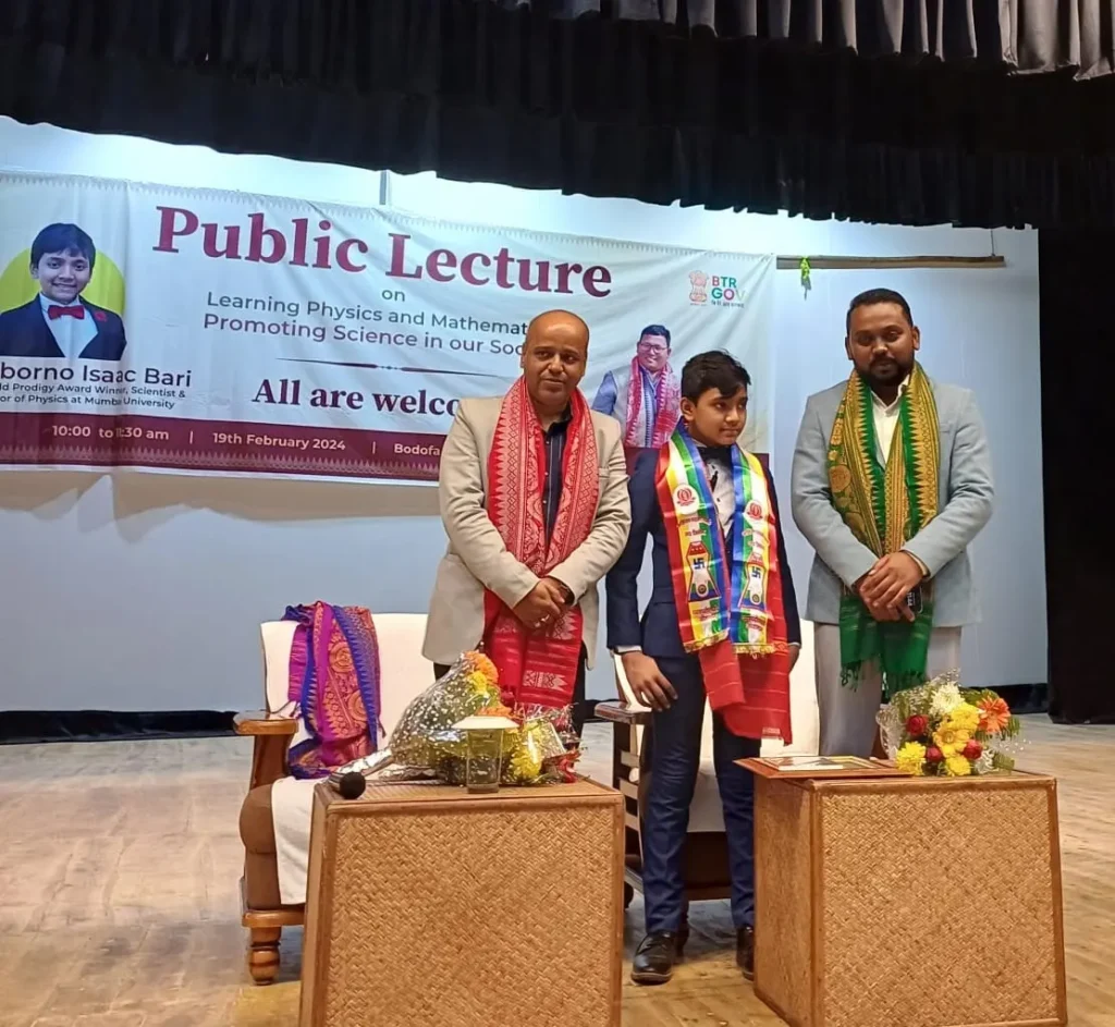 EM Hasda posted on FB, “Today at the Bodofa Cultural Complex in Kokrajhar, I had the pleasure of spending quality time with 11-year-old Prof. Suborno Isaac Bari. He was the honored guest at the ‘Public Lecture on Learning Physics & Mathematics: Promoting Science in Our Society’ program organized by the BTR Government. Local youth and students from various schools & colleges in the BTR engaged in enlightening conversations with Prof. Bari, leaving them inspired and thrilled by the encounter. He is often compared to the Einstein and Isaac Newton of the 21st century. Meeting him in person was truly an inspiring experience. Esteemed lecturers from different colleges, as well as from the Bodoland University among others, attended the event.”