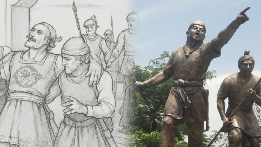 At this moment, Lachit, who was unable to walk, put his arms around the shoulders of a man named Nadai Kharangi. Nadai was Lachit’s support to stand and March into the battlefield.² With Nadai’s help, Lachit came down the steps of the gate house and boarded a war boat along with Nadai. The boatmen thought that the Borphukan was fleeing and hence turned the boat against the battlefield. Lachit was enraged and with the blunt edge of his sword, threw 4 shipmen into the river. This immediately spread among the soldiers of the Ahoms that Lachit Borphukan was throwing those soldiers into water whoever was trying to flee the battlefield. By that time, Lachit appeared into the battlefield and the Ahom soldiers became uncouraged to continue fighting. The Ahom forces turned their boats towards the Mughals, giving them a crushing defeat.¹