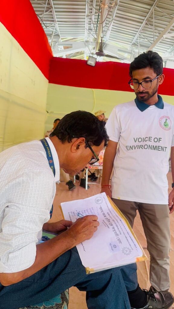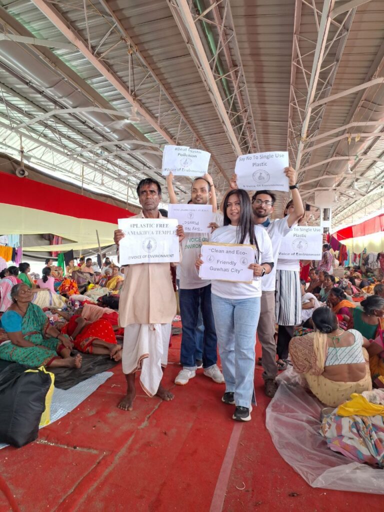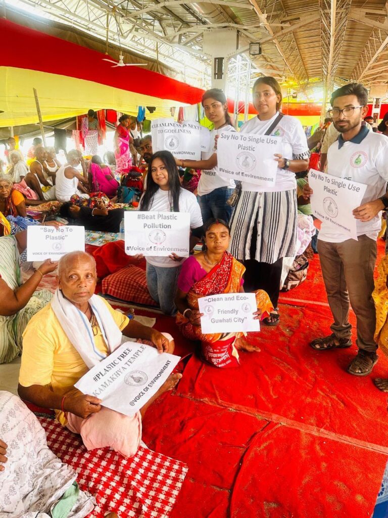Later, VoE members Mcdonald Choudhury, Hirak Joyti Kalita, and Deboprasad Choudhury visited the Ambubachi Mahayog Camp near Platform No.1, where they interacted with devotees and departmental officials, gathering pledges and signatures in support of a cleaner, greener festival.