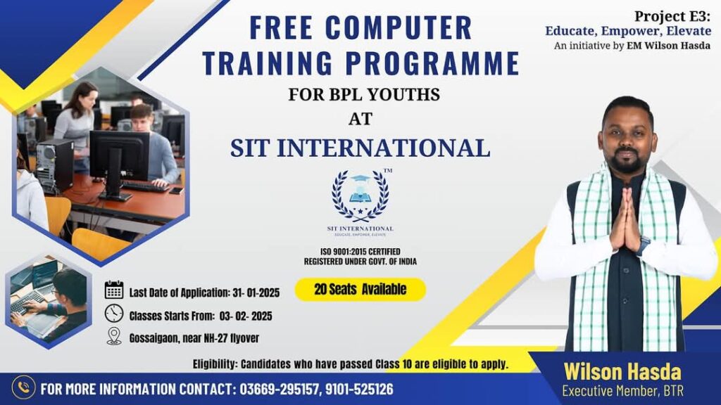 The training will be conducted at SIT International, a reputed computer institute located in Gossaigaon near the NH-27 flyover. The course is open to candidates who have passed Class 10 and can provide a valid BPL card or equivalent documents as proof of eligibility.